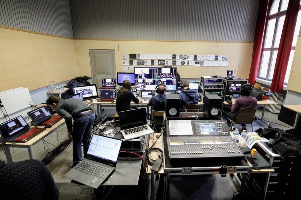 Nos ingénieurs maîtrisent la technique complète ces installation, transmission audio‑vidéo et la synchronisation pour des échanges fluides et naturels pour des événements allant du local à l’international.
